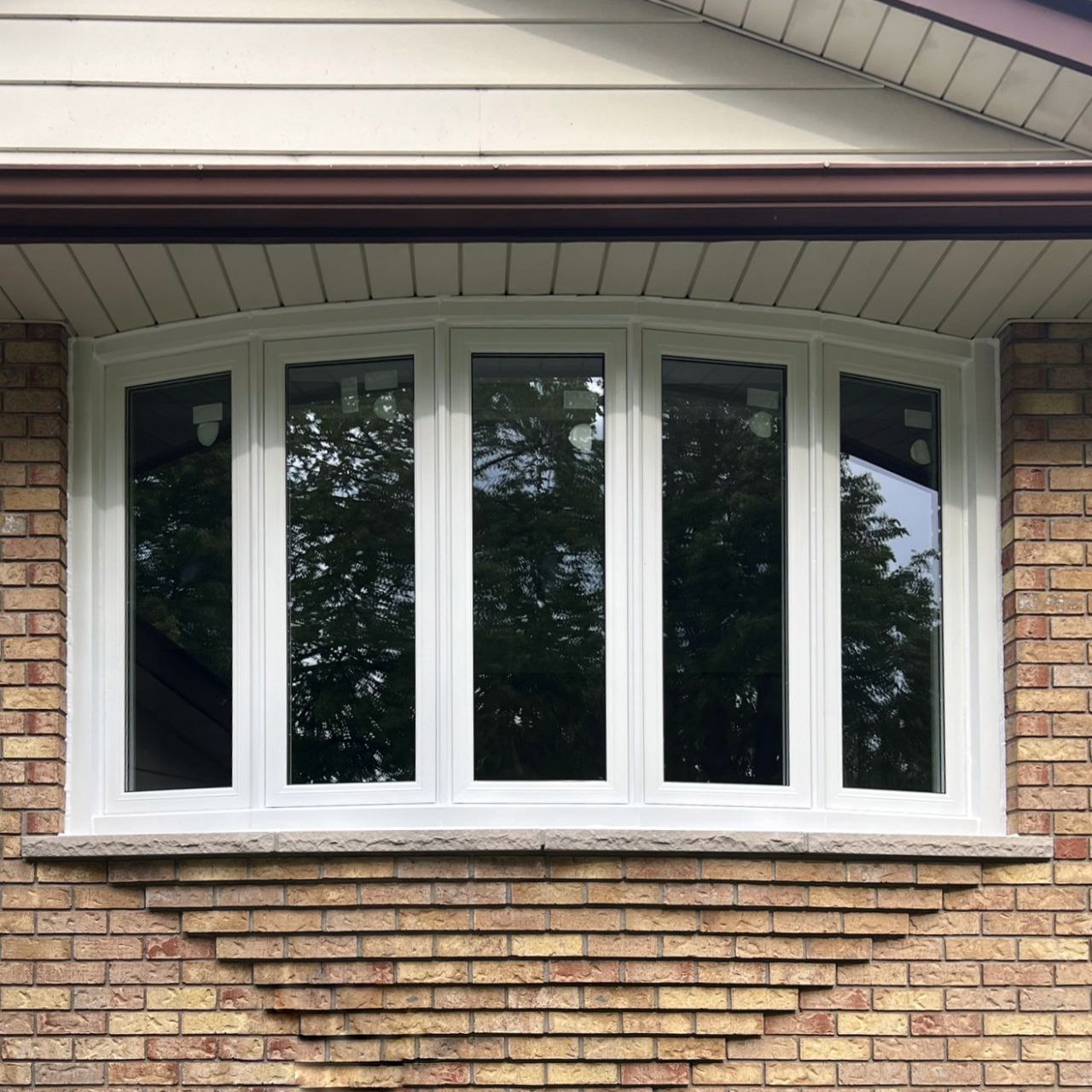 The bow assembly is installed, aligned, and secured to the wall structure and suspension system. The new bow window is insulated and sealed, and the exterior is finished with aluminum capping or siding, while the interior is completed with the new trim for a clean finished appearance.